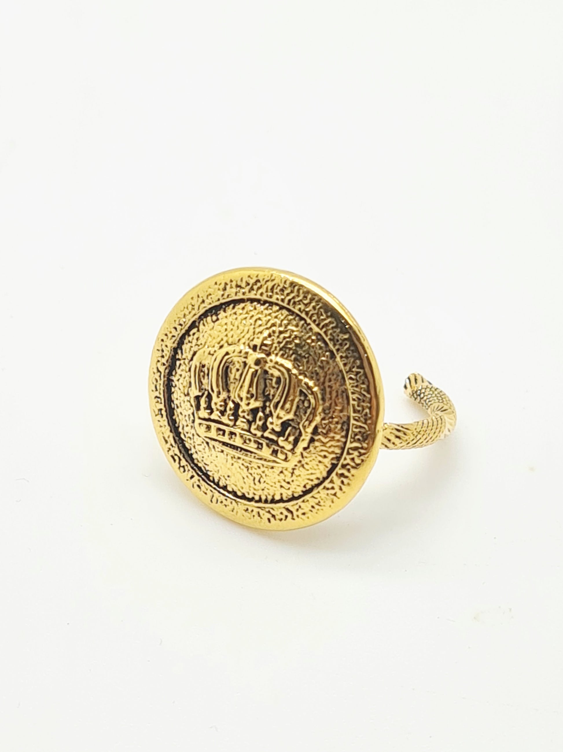 Bague ajustable UPCYCLING avec ce bouton de la garde britannique moulé et soudé sur un corps de bague fin en laiton et doré à l'or fin 24 carats.
